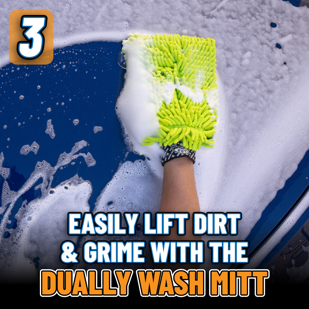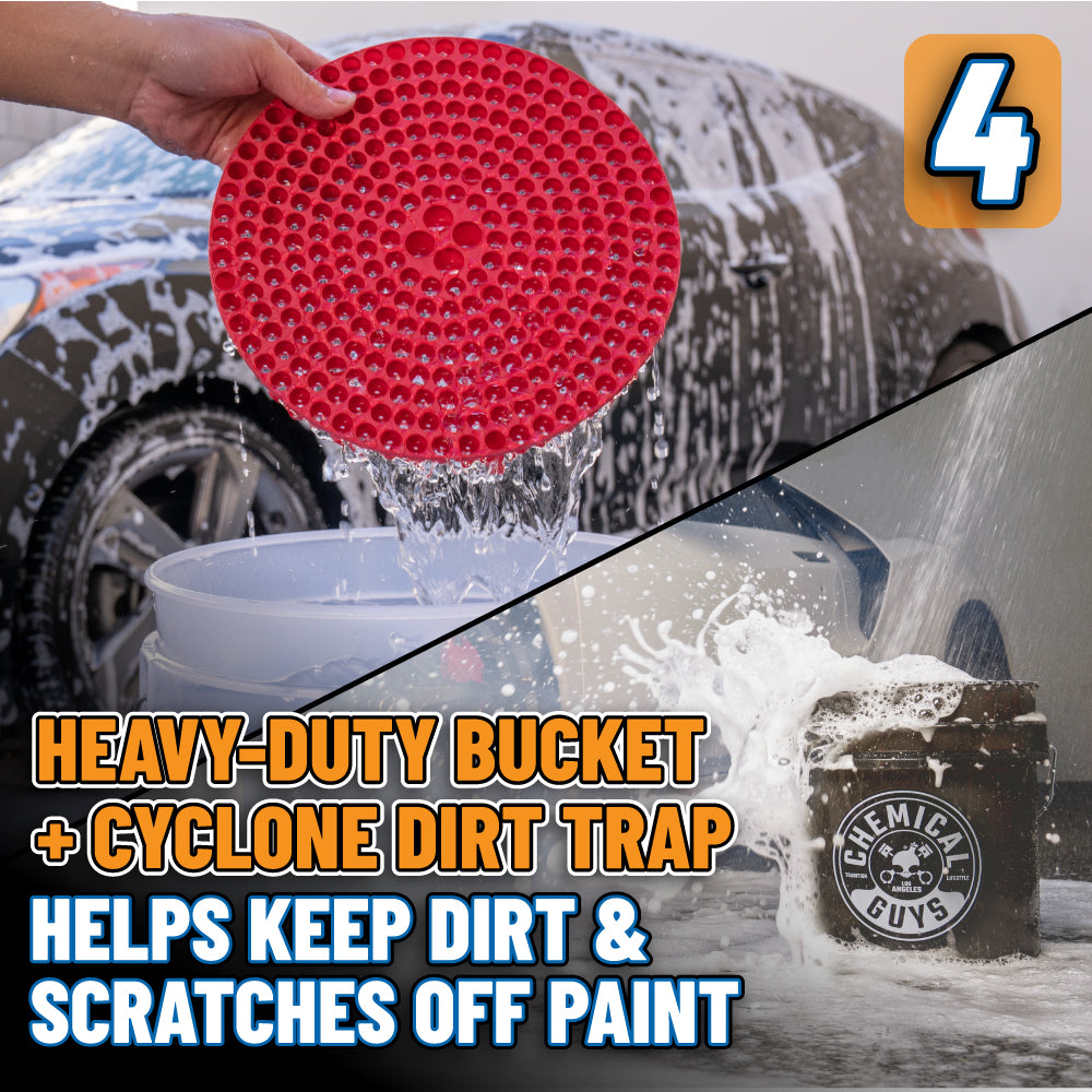The Megalodon Complete Care Kit offers everything for an upgraded shine. It includes premium dual-wax car soap. a 24×36 microfiber towel that absorbs over a gallon of water. a dirt trap. a foam blaster for max suds. and a heavy-duty bucket. Achieve spotless shine and lasting protection with ease and style.