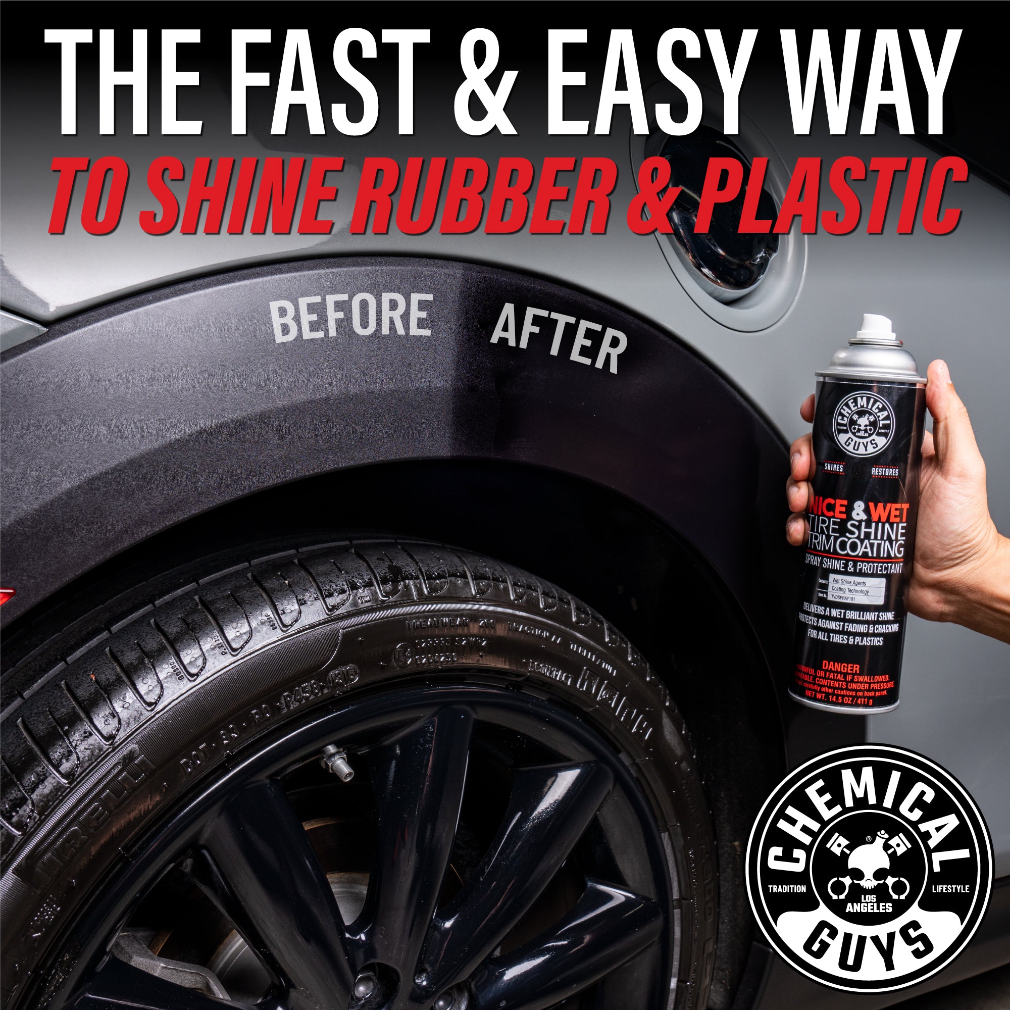 Nice and Wet is a foaming aerosol spray dressing that protects and restores rubber tires and trim pieces. leaving behind a super wet shine for that perfect showroom floor look. Just spray it on and allow it to dry for instant. easy shine.