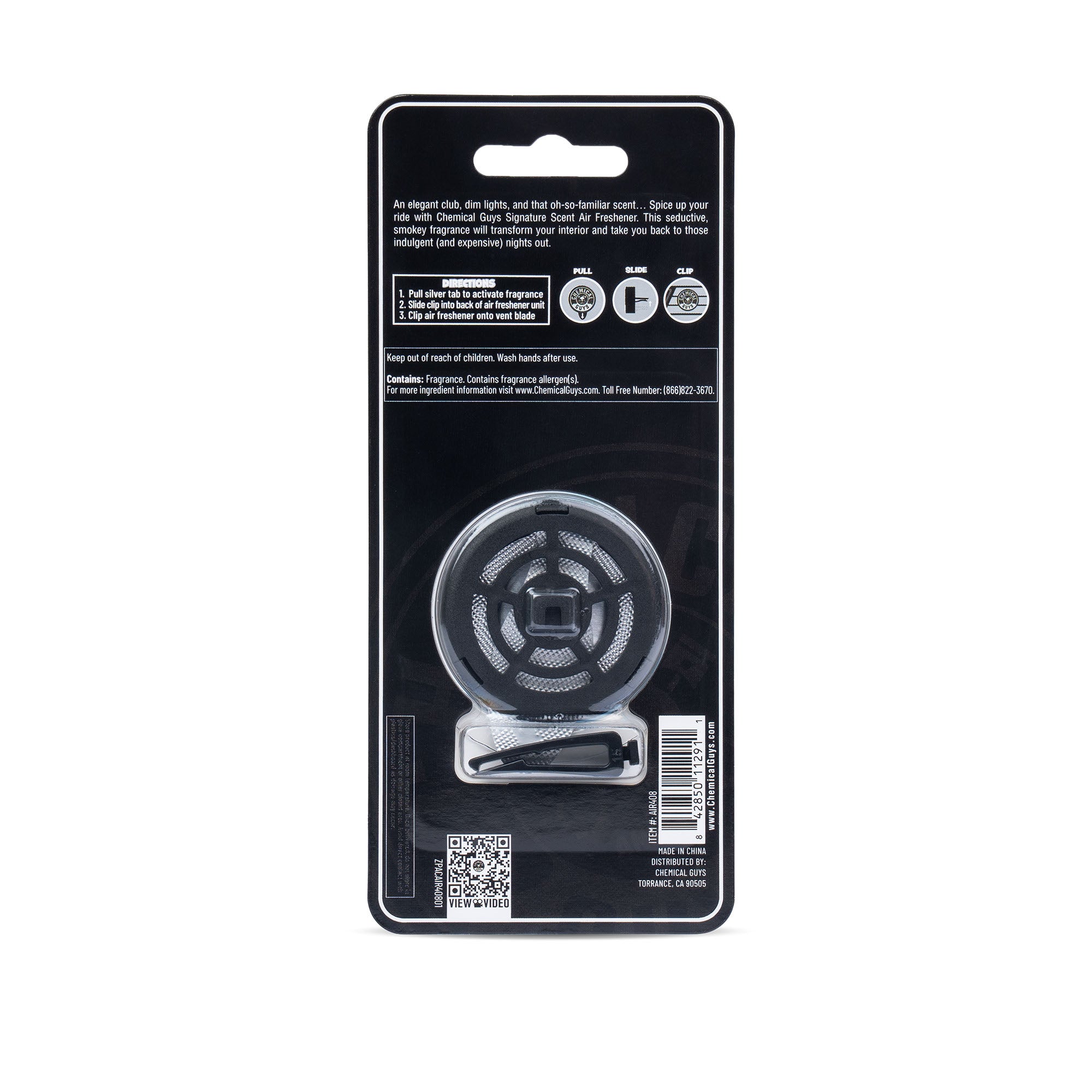 An elegant club. dim lights. and that oh-so-familiar scent??Spice up your ride with Chemical Guys Signature Scent Air Freshener. This seductive. smokey fragrance will transform your interior and take you back to those indulgent (and expensive) nights out.?